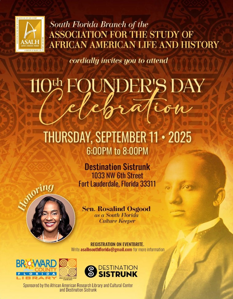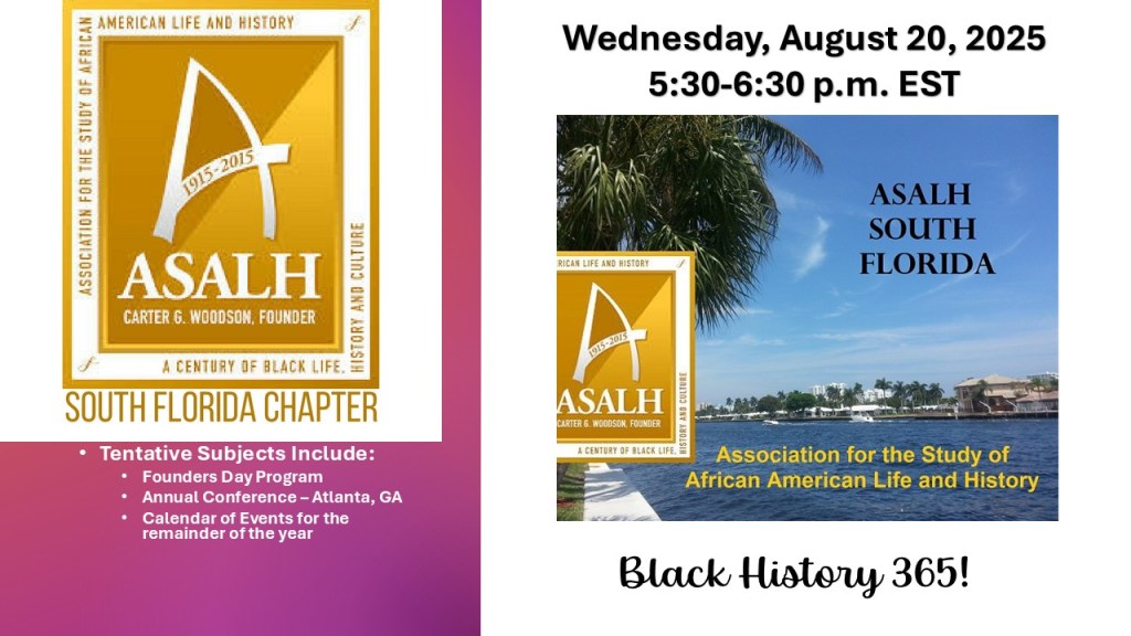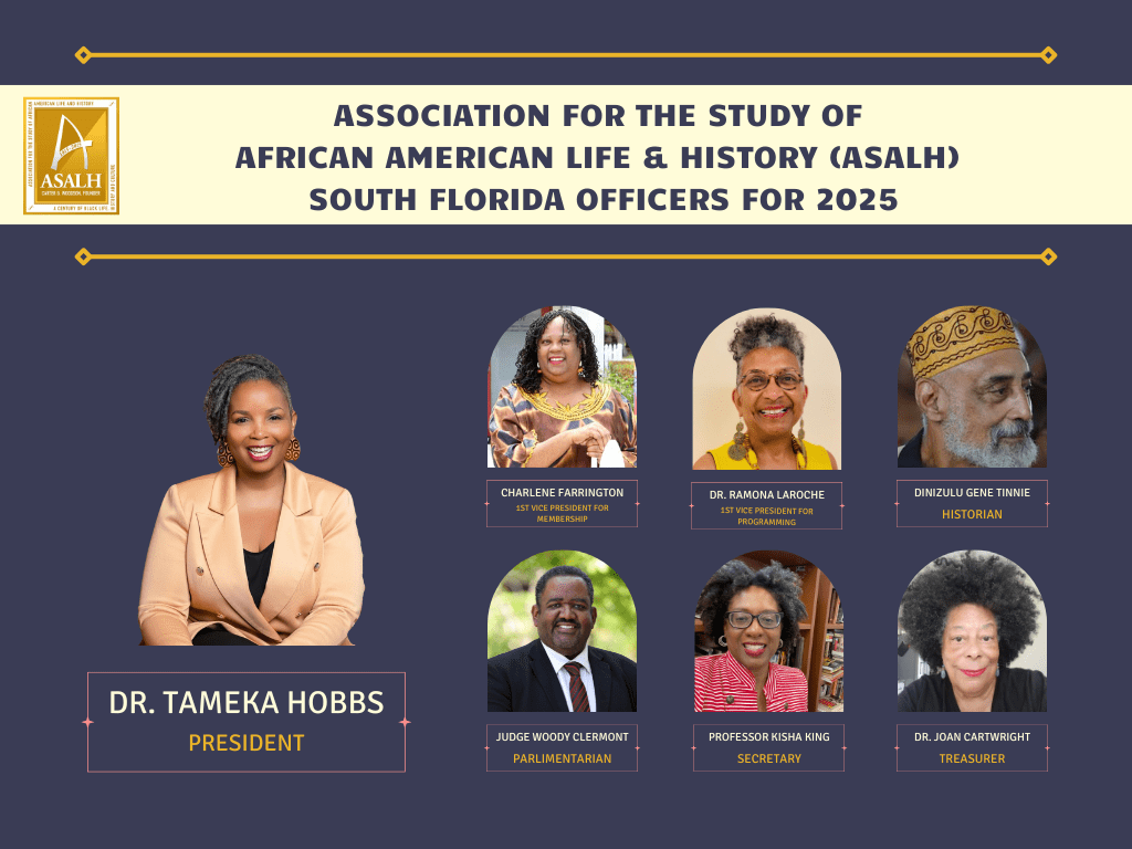 Welcome to the South Florida Branch of the Association for the Study of African American Life and History (ASALH). Our chapter was chartered on October 6, 2016, in Richmond, VA, with 22 chartered members.
