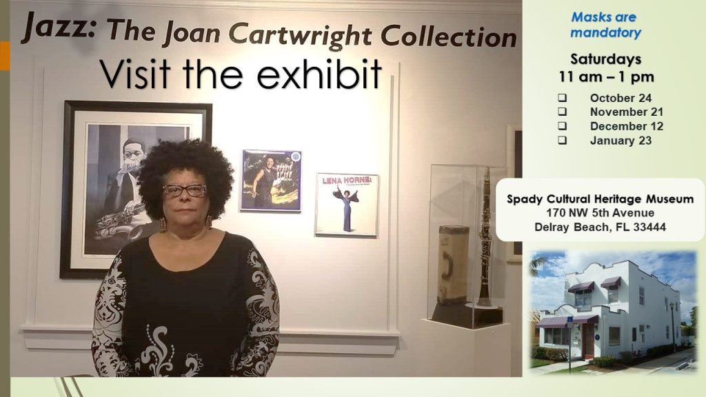 Charlene Farrington is exhibiting the Jazz art collection of Dr. Joan Cartwright at Spady Cultural Heritage Museum in Delray Beach, Florida, through the month of February 2021.
